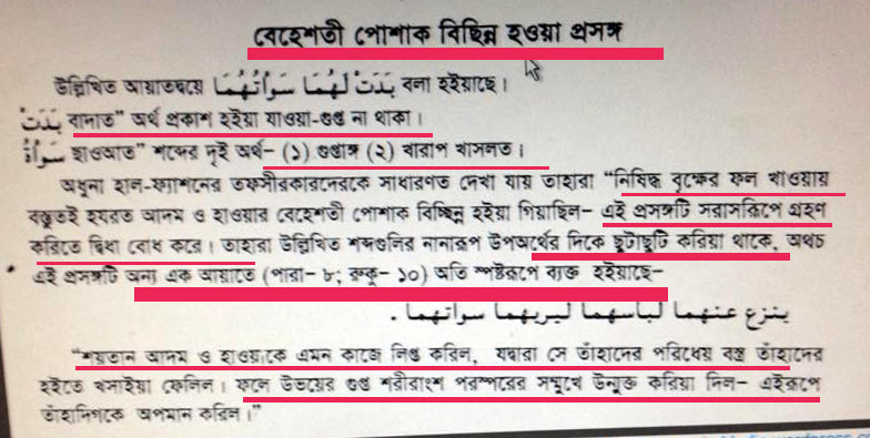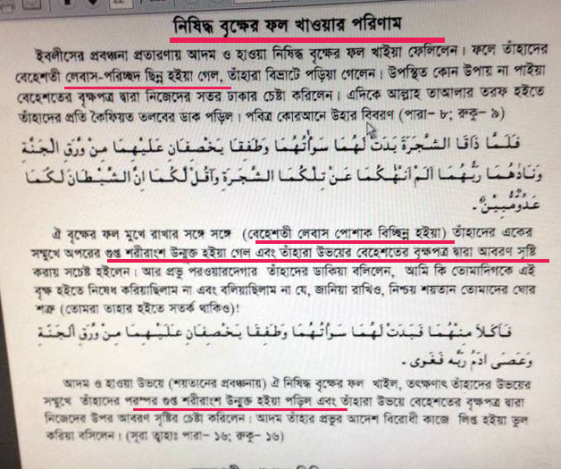অর্থ-“এভাবে যেতাদেরকে প্রবঞ্চিত করল, তৎপর যখনতারা সে বৃক্ষফলের আস্বাদ গ্রহণকরল, তখন তাদেরলজ্জাস্থান তাদের নিকটপ্রকাশ হয়ে পড়লএবং তারা উদ্যানপত্র দ্বারানিজেদেরকে আবৃত করতেলাগল, তখন তাদেরপ্রতিপালক তাদের সম্বোধন করেবললেন, আমি কিতোমাদের এ বৃক্ষসম্বন্ধে সাবধান করিনিএবং শয়তান যেতোমাদের প্রকাশ্য শত্রুআমি কি তাতোমাদেরকে বলিনি?” (সূরা- আরাফ, আয়াত- ২২) ।