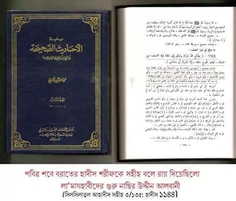 সালাফী লা’মাযহাবীদের অন্যতম গুরু নাছির উদ্দীন আলবানী তার “সিলসিলাতু আহাদীসি আস সহীহা” কিতাবে পবিত্র শবে বরাতের হাদীস শরীফকে সহীহ বলে উল্লেখ করে লিখেছে,