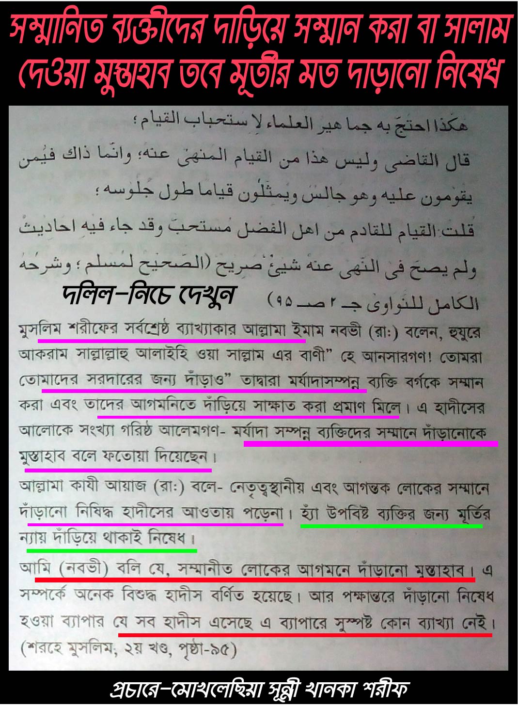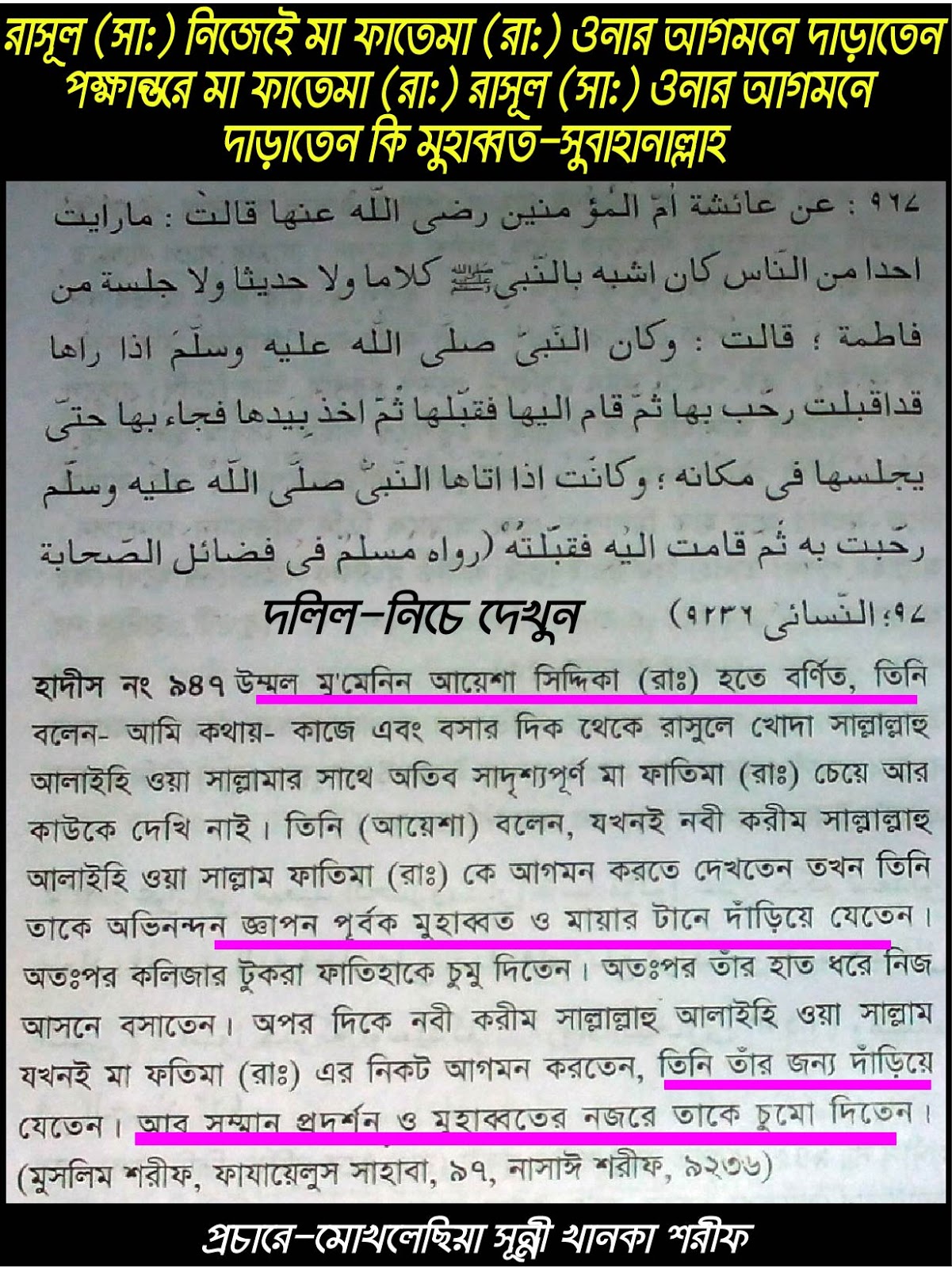 তখন তাঁর জন্য দাঁড়িয়ে যেতেন, হাত ধরে হাত চুমু খেতেন এবং নিজের জায়গায় তাঁকে বসাতেন। অনুরূপ হুযুর (ﷺ) যখন হযরত ফাতিমা যুহরা (رضي الله عنه) এর কাছে তশরীফ নিয়ে যেতেন, তখন তিনি (ফাতিমা) ও দাঁড়িয়ে যেতেন, দস্ত মুবারকে চুমু খেতেন এবং স্বীয় জায়গায় হুযুর (ﷺ)কে বসাতেন। মিরকাতالمشئ بالجنازة অধায়ের দ্বিতীয় পরিচ্ছেদে আছে-