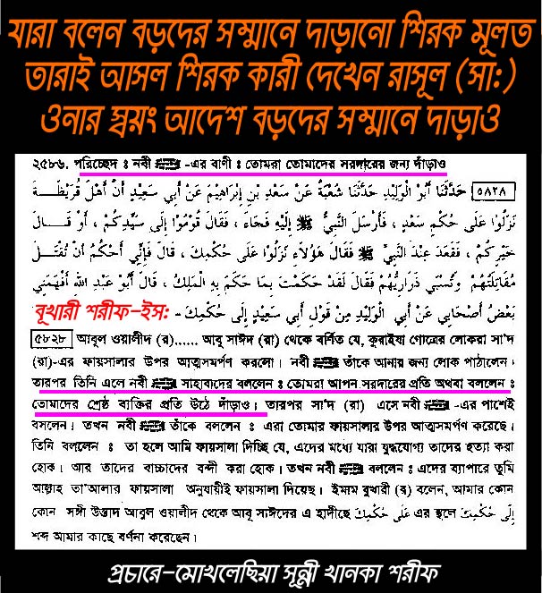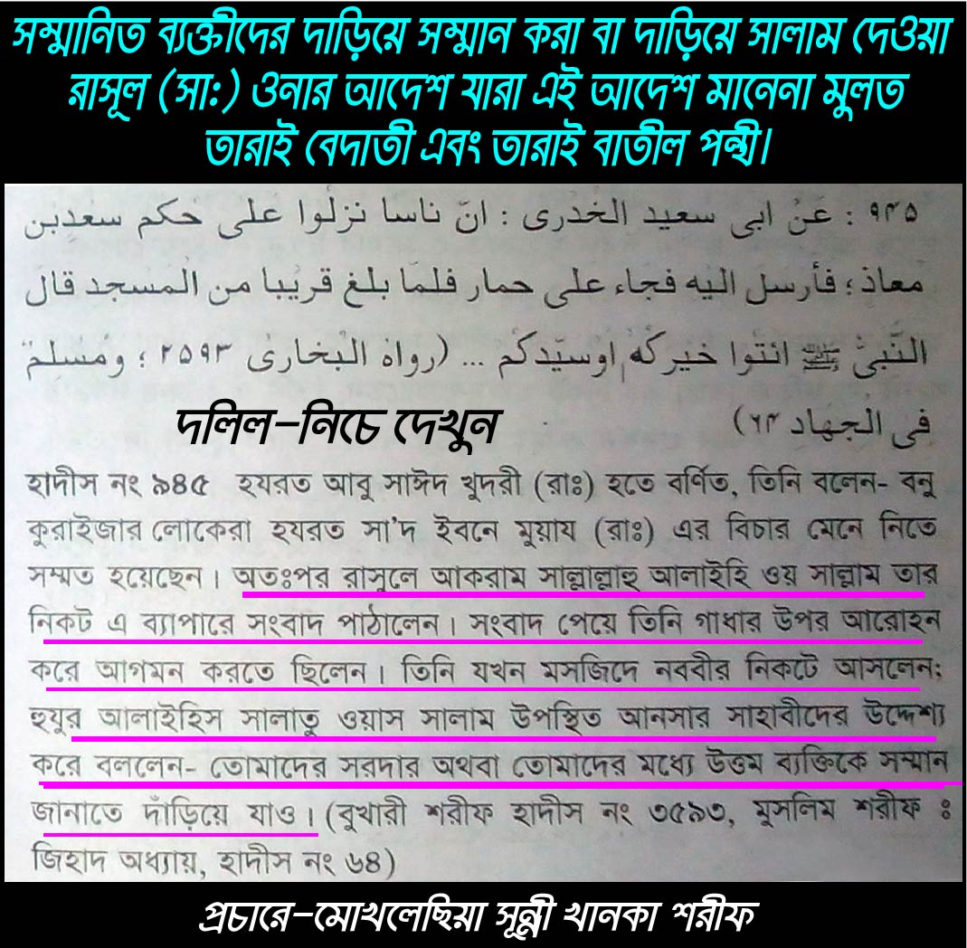 দ্বিতীয়তঃ যখন কোন ধর্মীয় নেতা আসেন, তাঁর সম্মানে দাঁড়িয়ে যাওয়া সুন্নাত। অনরূপ কোন ধর্মীয় নেতা সামনে দাঁড়ালে তার জন্য দাড়িয়ে থাকা সুন্নাত। কিন্তু বসে থাকা বেআদবী। মিশকাত শরীফের প্রথম খন্ডে কিতাবুল জিহাদে – القيام ও حكم الاسر اء শীর্ষক অধ্যায়ে উল্লেখিত আছে যে- যখন হযরত সাআদ ইবনে মুআয (رضي الله عنه) মসজিদে নববীতে উপস্থিত হন, তখন হুযুর (ﷺ) আনসারদেরকে হুকুম দিলেন- قُوْمُوْا اِلى سَيِّدِكم আপনাদের নেতার জন্য দাঁড়িয়ে যান। এ দাড়ানো ছিল সম্মানবোধক। তাদেরকে বাধ্য করে দাঁড় করানো হয়নি। অধিকন্তু ঘোড়া থেকে নামানোর জন্য ২/১ জন্যই যথেষ্ট ছিল। কিন্তু সবাইকে কেন বললেন যে দাঁড়িয়ে যাও। আর ঘোড়া থেকে নামানোর জন্য মজলিসে আগতদের মধ্যে থেকে কাউকে ডাকা যেত। কিন্তু নির্দিষ্ট করে আনসারদেরকে কেন হুকুম করলেন? স্বীকার করতেই হবে যে, এ কিয়ামটা ছিল সম্মান বোধক। হযরত সাআদ আনসারদের নেতা ছিলেন। তাই তাদের দ্বারা তাযীম করানো হয়েছে। যাঁরা উপরোক্ত বাক্য ব্যবহৃত الىশব্দ দ্বারা ধোঁকা দিয়ে বলেন যে এ দাঁড়ানোটা ছিল রোগীর সাহায্যার্থে, তারা তাহলে এ আয়াতে কি বলনে- اِذَاقُمْتُمْ اِلى الصَّلوةِ (যখন আপনারা নামাযের জন্য দাঁড়াবেন।)