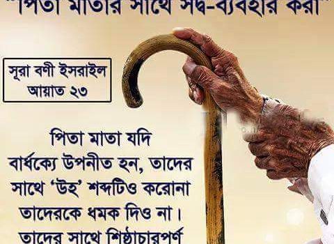 “আর তোমার প্রতিপালক নির্দেশ দিয়েছেন যে, তাঁকে ছাড়া অন্য কারো ইবাদত করো না এবং পিতা-মাতার সাথে সদ্ব্যবহার কর। যদি পিতা-মাতার কোনও একজন কিংবা উভয়ে তোমার জীবদ্দশায় বার্ধক্যে উপনীত হন, তবে তুমি তাদেরকে ‘উফ’ শব্দটি পর্যন্ত বলো না এবং তাদেরকে ধমক দিও না বরং তাদের সাথে বিনম্রভাবে সম্মাসূচক কথা বল। আর তাদের প্রতি ভক্তি-শ্রদ্ধা মমতাপূর্ণ আচরণের সাথে তাদের সামনে নিজেকে বিনয়াবনত কর। আর দোয়া কর, হে আমার প্রতিপালক! তাদের উভয়ের প্রতি রহমতের আচরণ করুন, যেভাবে তাঁরা শৈশবে আমাকে লালন-পালন করেছেন (সূরা বনী ঈসরাইল আয়াত: ২৩-২৪)