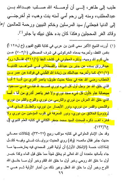 এখানে ↑ সর্বপ্রথম সৃষ্টি সম্পর্কে বিশাল আলোচনার পর নুরে মোহাম্মদী (ﷺ) কে সর্বপ্রথম সৃষ্টি বলে মতামত দিয়েছেন। পেন্সিল দ্বারা নিচে দাগ দেয়া হয়েছে।