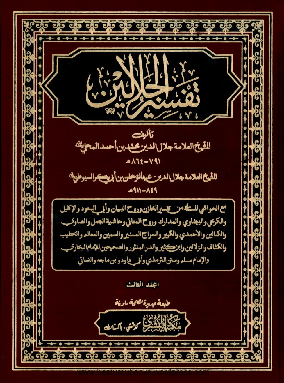 উপরের ছবিতে যা দেখতে পাচ্ছেন তা হলো বিশ্ববিখ্যাত ‘তাফসির আল-জালালাইন’ শরীফের প্রচ্ছদ।এটি এমন একটি সংক্ষিপ্ত তাফসির যার অধ্যয়নে কোরআনুল কারীমের মোটামুটি বিশুদ্ধ তাফসির/ব্যাখ্যা জানা যায়।এবং এর জনপ্রিয়তার অন্যতম প্রমাণ হচ্ছে,এই কিতাবটি আহলে সুন্নত এবং দেওবন্দী সেক্টর প্রায় বৃহৎ সকল শিক্ষাঙ্গনে পঠিত হয়।