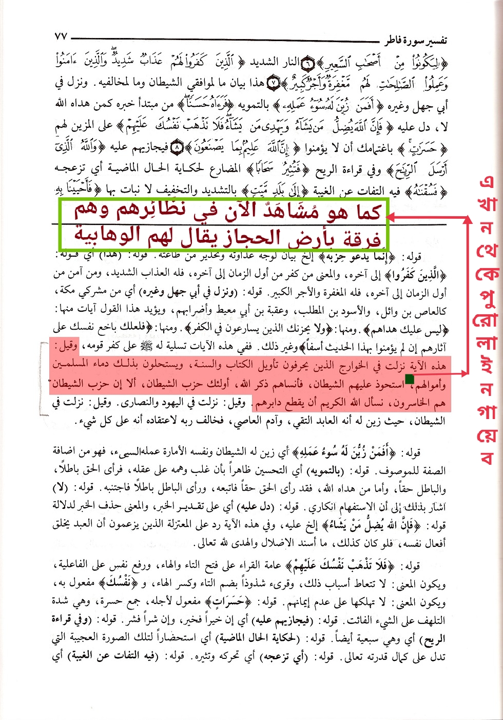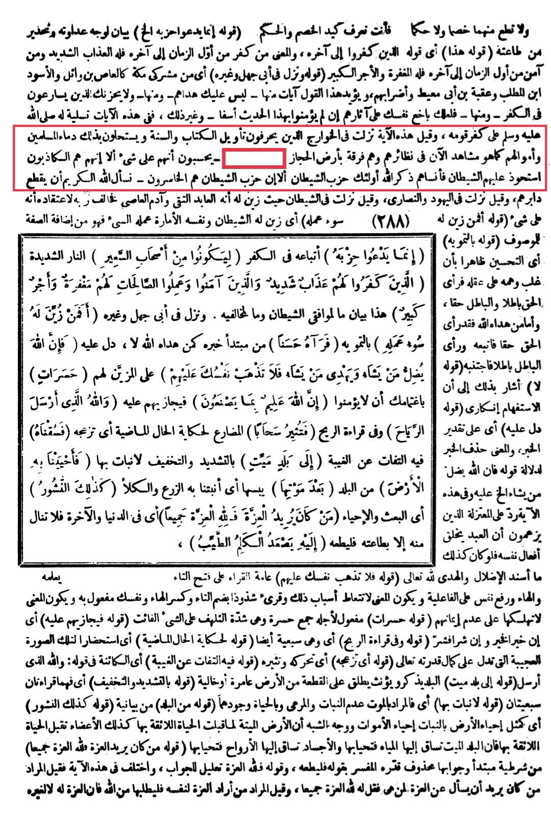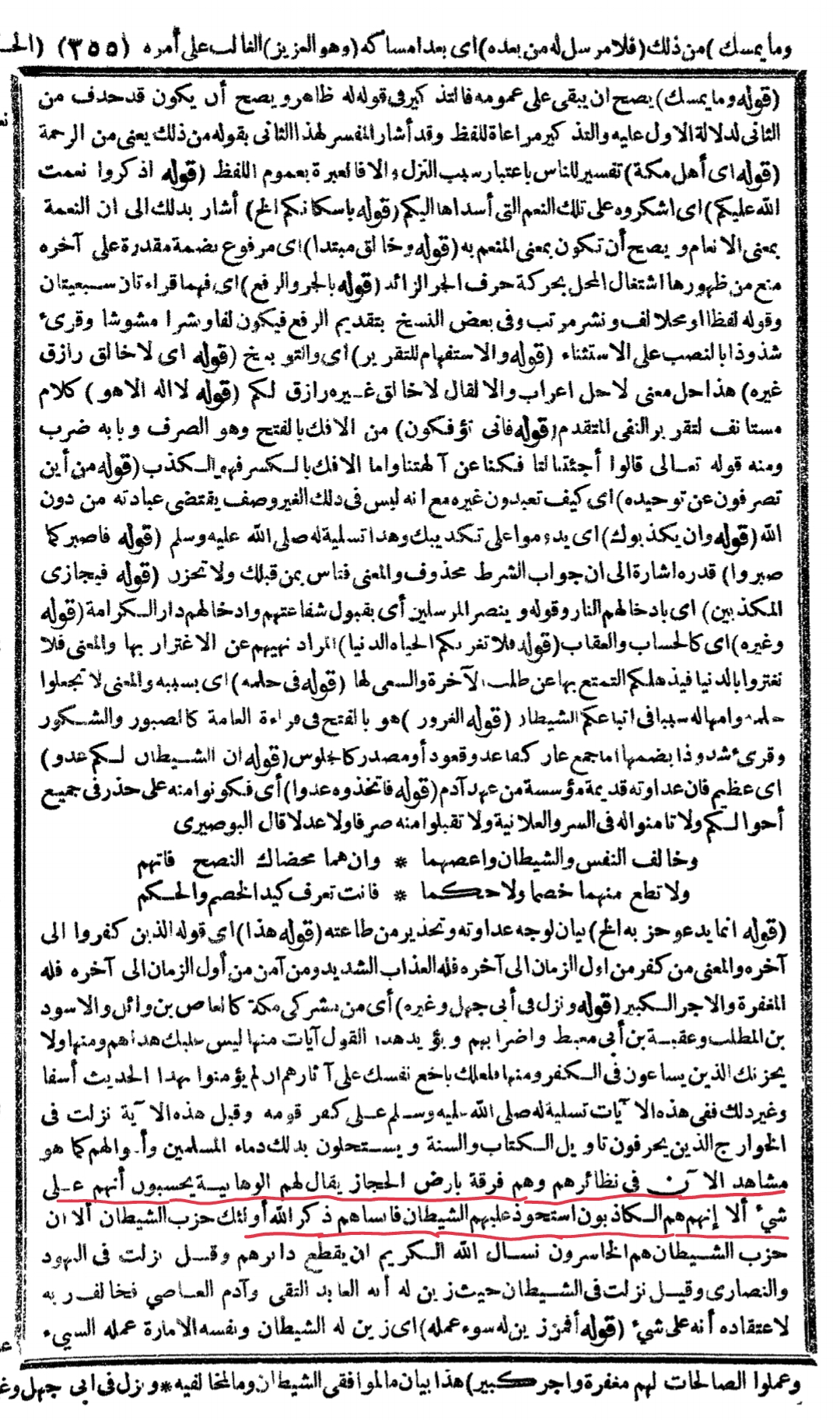 অর্থঃ”আয়াতটি খারেযীদের ব্যাপারে নাযিল হয়েছে যারা কোরআন এবং সুন্নাহর অপব্যাখ্যা করতো যেন তাতে সাধারণ মুসলমানদের জান মালের ক্ষতি করতে পারে।যেমনকি তাদের অনুসারীদের মধ্যে আজো দেখা যাচ্ছে।তারা হচ্ছে হেজাজের(সৌদী আরব) যমিনের একটা গোষ্ঠী,যারা ওয়াহাবী নামে পরিচিত। তাদের ধারণা যেনো তারাই সঠিক,কিন্তু তারা মিথ্যাবাদী।শয়তান এদেরকে পাকড়াও করে ফেলেছে,এবং তাই তারা আল্লাহর যিকর হতে বিরত আছে।তারাই হলো ‘হিযবুশ শায়তান’ বা শয়তানের দল। এবং শয়তানের সমস্ত দল ক্ষতিগ্রস্থ।আমরা আল্লাহর কাছে দোয়া করি,যেন আল্লাহ তাদেরকে নস্যাৎ করেন।”