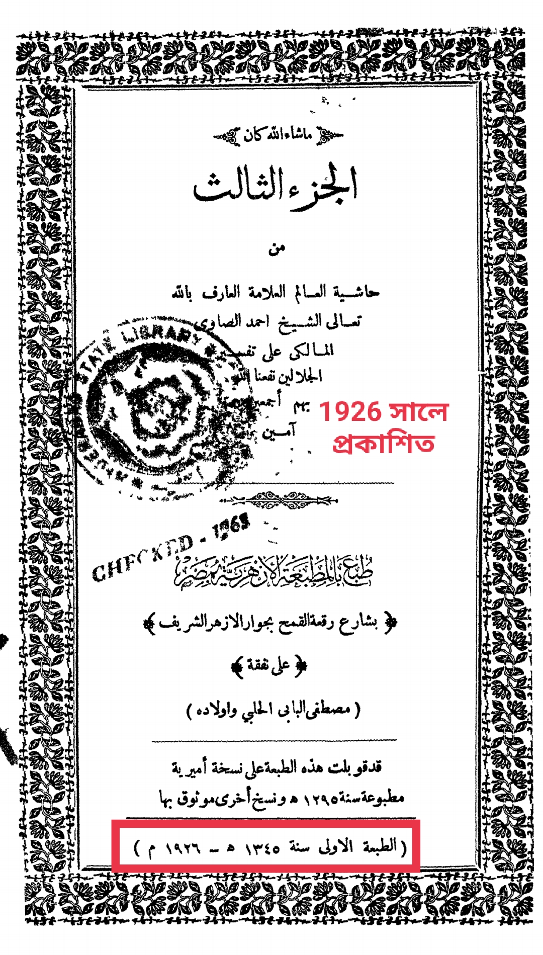 এটার প্রমাণ দেখাতে আমরা দেখাচ্ছি ১৯২৬ সালে আল আজহার বিশ্ববিদ্যালয়ের প্রেস হতে মুদ্রিত কপি,যেখানে স্পষ্ট উল্লেখ আছে বাক্যটি।