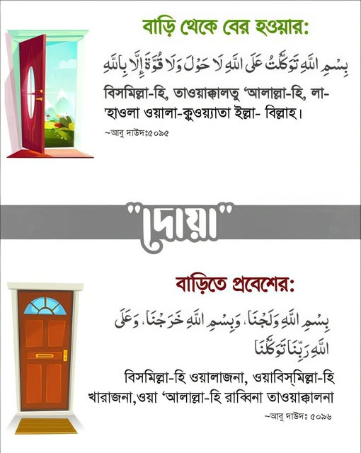 আল্লাহ্র নামে (বের হচ্ছি)। আল্লাহর উপর ভরসা করলাম। আর আল্লাহর সাহায্য ছাড়া (পাপ কাজ থেকে দূরে থাকার) কোনো উপায় এবং (সৎকাজ করার) কোনো শক্তি কারো নেই। [১]