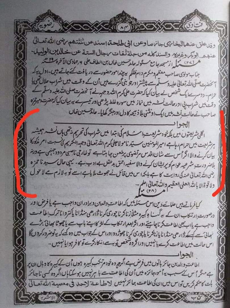জিজ্ঞাসাঃ শেরে খোদা মাওলা আলী আলাইহিস সালামার মদপান ও নামাজে সুরা ভুল পড়া সংক্ৰান্ত এক প্ৰশ্নের জবাবে ফাতওয়ায়ে রেজভীয়ার দশম খন্ডের ৮৪ নং পৃষ্ঠার (১২ খন্ডের সেটের) ২৭ নং মাসআলার জবাবে লিখা রয়েছে যে,