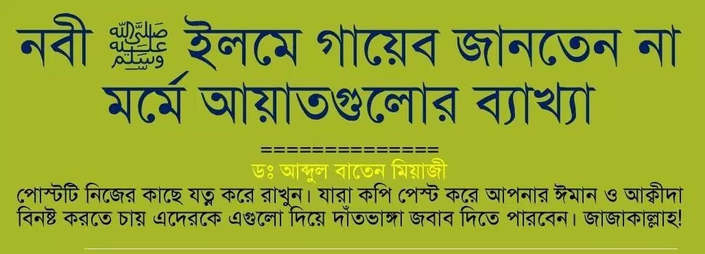 নিচে, আল্লাহ পাকের অশেষ রহমতে ইলমে গায়েব নিয়ে এমনই কিছু আয়াতের বিশ্লেষণ করছি যেগুলো এরা সচরাচর উল্লেখ করে সাধারণ মুসলমানকে বিভ্রান্ত করে থাকে। এগুলো আপনাদের কাছে জমা করে রাখুন। যাতে কোন গোমরাহ ব্যক্তি কপি পেস্ট করে আপনার ঈমান আর আক্বীদাকে দুর্বল করতে আসলেই আপনি এগুলো তার দিকে ছুড়ে মারতে পারেন। শয়তান যেমন আজান শুনলে পালিয়ে যায়, এরাও দেখবেন, জবাব দিতে অক্ষম হয়ে পালিয়ে যাবে কিংবা প্রসংগ পালটিয়ে আপনাকে অন্য বিষয়ে ওয়াসওাসা দেবে। তাদের বহু উল্লেখিত আয়াতসমূহ হলো নিম্নরূপঃ