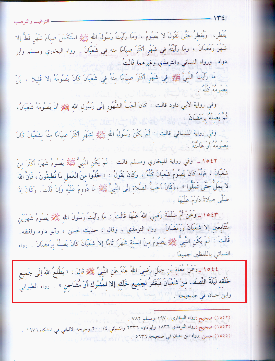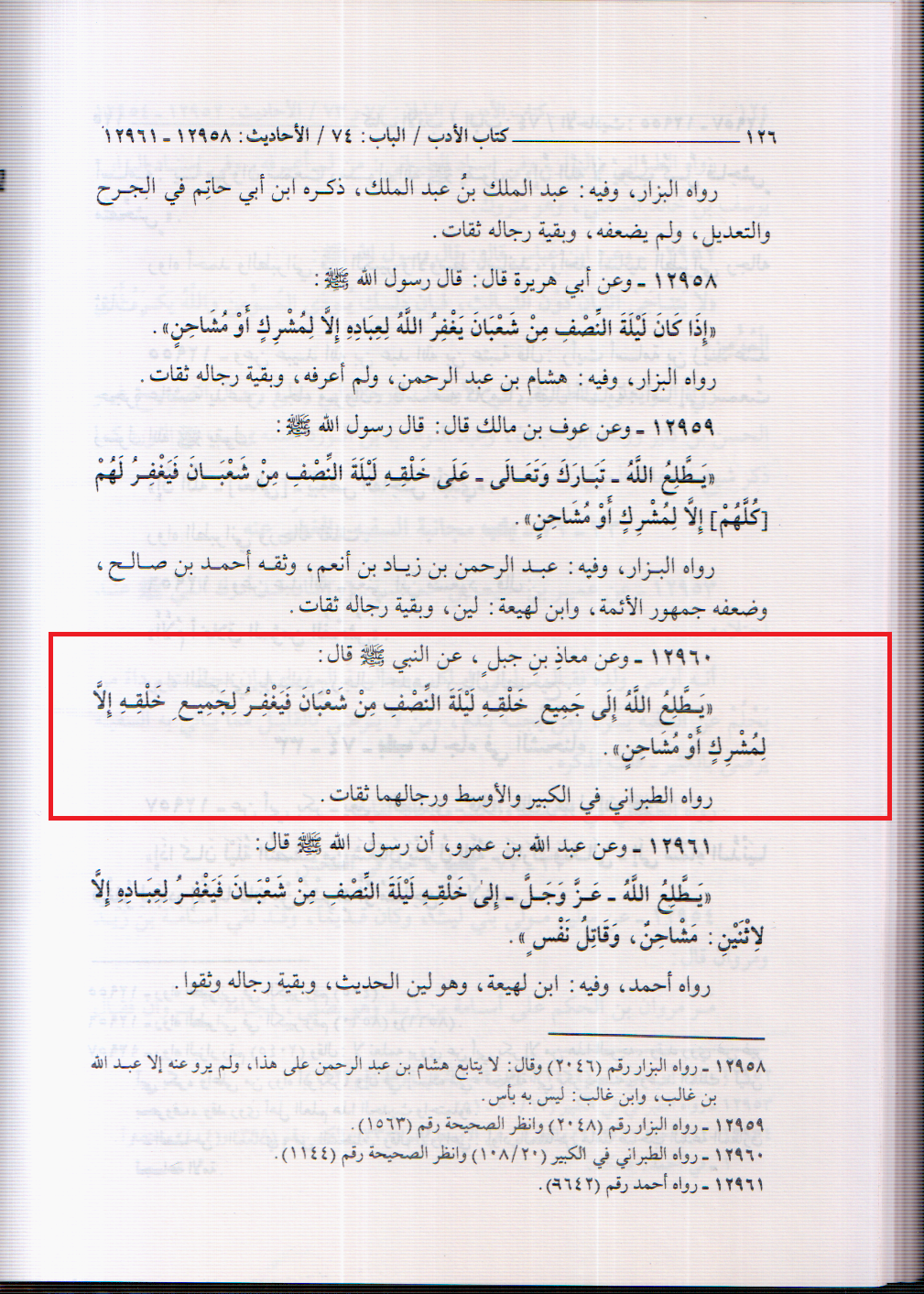 “يطلع الله إلى جميع خلقه ليلة النصف من شعبان، فيغفر لجميع خلقه، إلا لمشرك، أو مشاحن”.