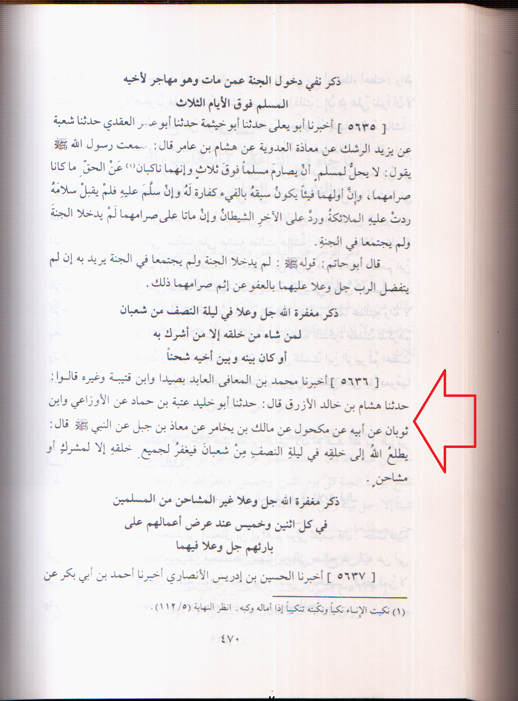 أَخْبَرَنَا مُحَمَّدُ بْنُ الْمُعَافَى الْعَابِدُ بِصَيْدَا ، وَابْنُ قُتَيْبَةَ وَغَيْرُهُ ، قَالُوا : حَدَّثَنَا هِشَامُ بْنُ خَالِدٍ الأَزْرَقُ ، قَالَ : حَدَّثَنَا أَبُو خُلَيْدٍ عُتْبَةُ بْنُ حَمَّادٍ ، عَنِ الأَوْزَاعِيِّ ، وَابْنِ ثَوْبَانَ ، عَنْ أَبِيهِ ، عَنْ مَكْحُولٍ ، عَنْ مَالِكِ بْنِ يُخَامِرَ ، عَنْ مُعَاذِ بْنِ جَبَلٍ ، عَنِ النَّبِيِّ صَلَّى اللَّهُ عَلَيْهِ وَسَلَّمَ قَالَ : يَطْلُعُ اللَّهُ إِلَى خَلْقِهِ فِي لَيْلَةِ النِّصْفِ مِنْ شَعْبَانَ فَيَغْفِرُ لِجَمِيعِ خَلْقِهِ إِلاَّ لِمُشْرِكٍ أَوْ مُشَاحِنٍ