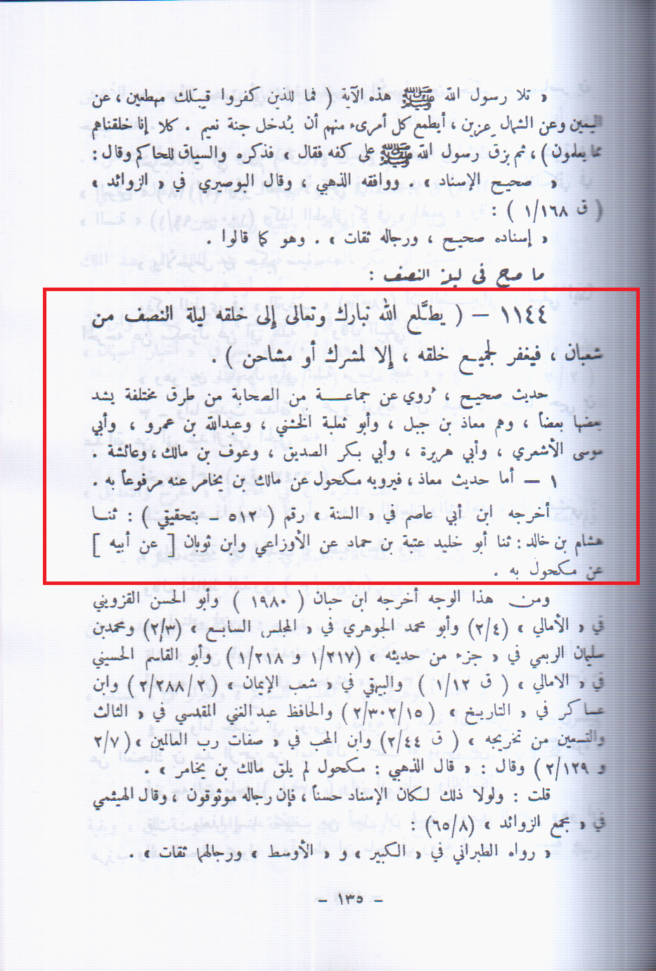 “ হাদীসটি সহীহ। কেননা একদল সাহাবী রদ্বিয়াল্লাহু আনহু থেকে বিভিন্ন সূত্রে নিসফে শাবানের মর্যদা ওপর একাধিক হাদীস শরীফ বর্ণিত আছে। বিভিন্ন সূত্রে বর্ণিত হওয়ার কারনে হাদীস শরীফটি মজবুতি লাভ করেছে। যে সকল সাহাবী রদ্বিয়াল্লাহু আনহু থেকে হাদীস শরীফ বর্ণিত আছে উনারা হলেন, হযরত মু’আয ইবনে জাবাল রদ্বিয়াল্লাহু আনহু , হযরত আবু সালাবা রদ্বিয়াল্লাহু আনহ, হযরত আব্দুল্লাহ বিন ওমর রদ্বিয়াল্লাহু আনহু,হযরত আবু মূসা আল আশ’আরী রদ্বিয়াল্লাহু আনহু, হযরত আবু হুরাইরা রদ্বিয়াল্লাহু আনহু , হযরত আবু বকর ছিদ্দীক রদ্বিয়াল্লাহু আনহু, হযরত আউফ বিন মালেক রদ্বিয়াল্লাহু আনহু, হযরত আয়েশা সিদ্দীকা রদ্বিয়াল্লাহু আনহা। এছাড়াও অনেক আকাবীর সাহাবী রদ্বিয়াল্লাহু আনহুগন হাদীস শরীফ বর্ণনা করেরন। (দলীল: সিলসিলাতু আহাদীসি আস সহীহা ৩য় খন্ড ১৩৫ পৃষ্ঠা: হাদীস নম্বর ১১৪৪ , মূল কিতাবের স্ক্যন কপি দেয়া হলো)